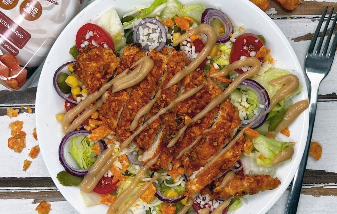 Solange das Hähnchen backt, den Salat zubereiten. Anschließend das krosse Hähnchen in Streifen schneiden, über den Salat geben und zu guter Letzt mit der Burger Sauce toppen.
