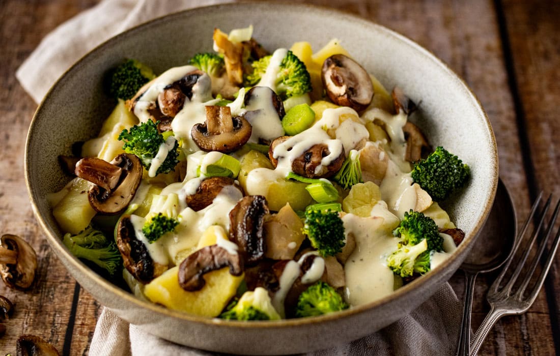 Die Protein Sahnesauce anrühren und bei geringer Hitze unter die Pfanne heben.