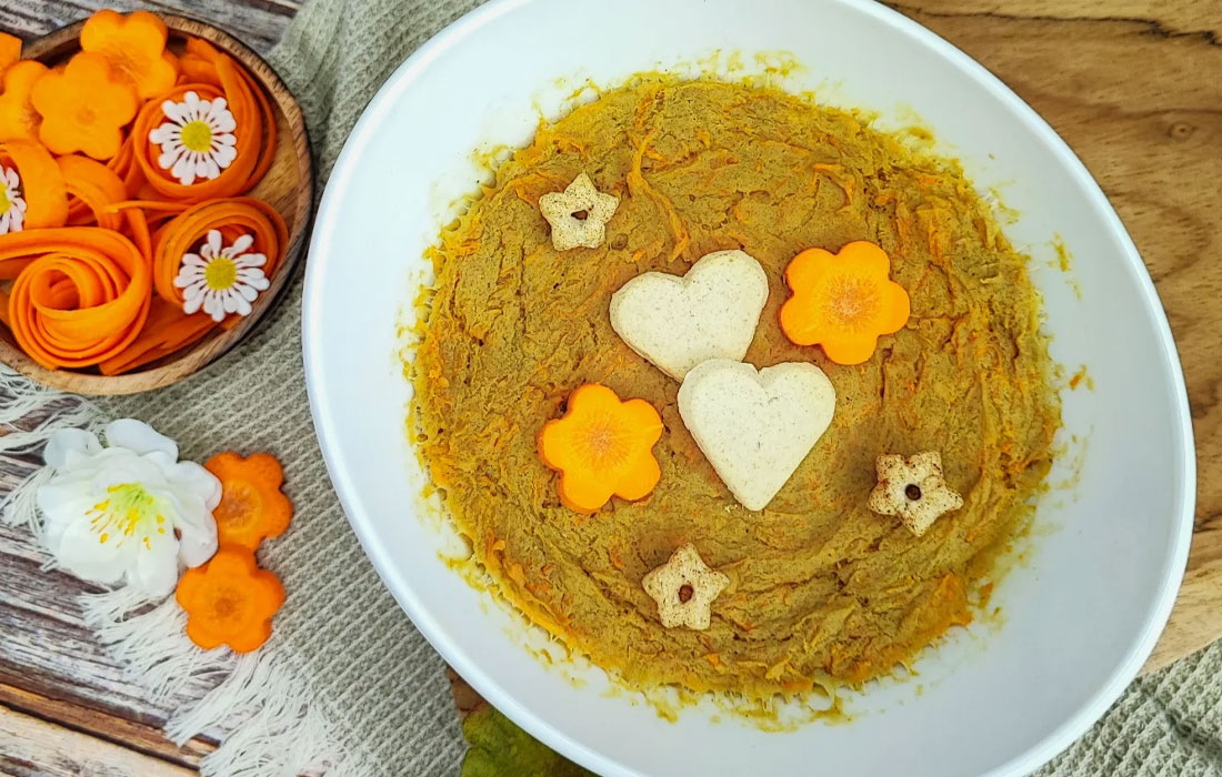 Zuerst alle Trockenzutaten mit dem Wasser zu einer cremigen Masse verrühren und dann die geraspelte Möhre unterrühren.