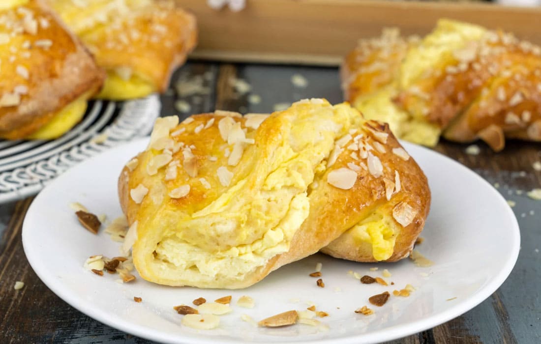 Mit dem Eigelb einpinseln und ein paar gehobelten Mandeln drüberstreuen. Für ca. 15min in den Backofen schieben oder solange, bis sie außen goldbraun geworden sind. (Tipp: Vor dem Verzehr gut abkühlen lassen!)