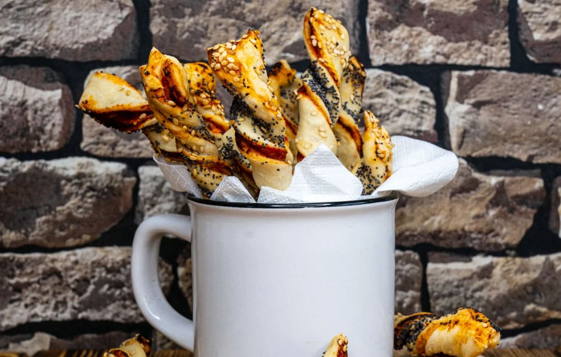 Den ausgerollten Teig dem gewürzten Tomatenmark bestreichen, in Streifen schneiden, die Enden übereinanderklappen. Mit etwas Öl einpinseln, in Mohn und Sesam wälzen und die Knusperstangen ineinander eindrehen.