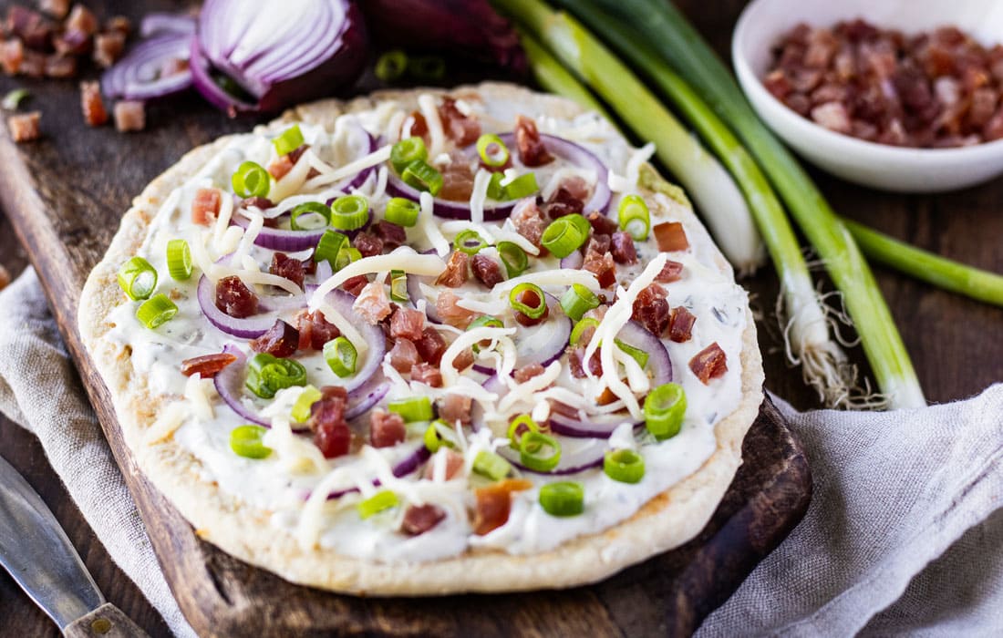 Den Teig auf einer bemehlten Fläche ausrollen (viel dünner als bei einer Pizza) und mit der Creme bestreichen. Die Zwiebelringe/-streifen sowie die Schinkenwürfel auf dem Flammpi verteilen und in den Ofen schieben, bis der Rand schön kross sind (dauert ca. 20min).