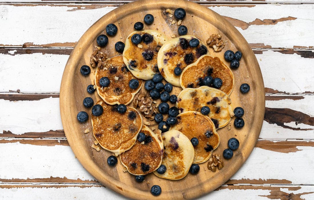Etwas Ölspray in eine Pfanne geben und 8 kleine Protein Pancakes darin ausbacken.