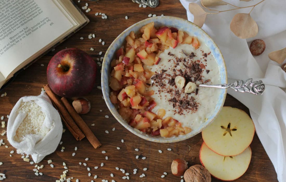 Den Milchreis-Pudding mit den Bratapfel-Stückchen toppen und noch warm genießen.