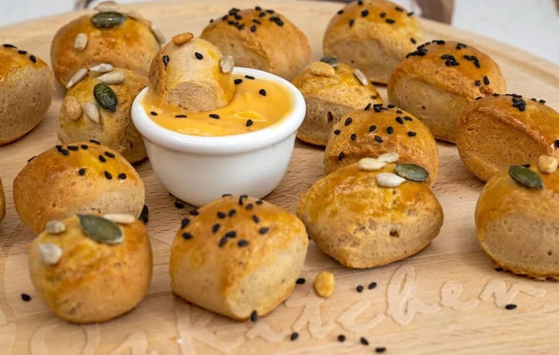 Anschließend noch etwas Eigelb auf die Häppchen streichen und die Körner darüberstreuen.