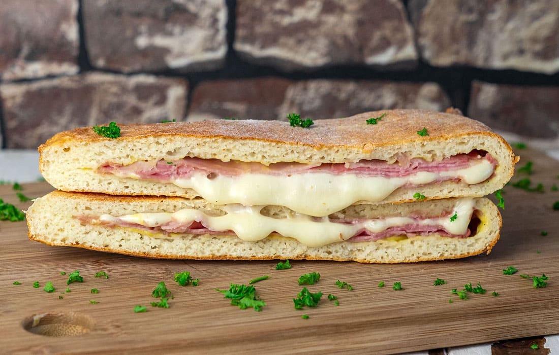 Das komplette Naan mit der Senf-Honig-Schnittlauch Creme bestreichen (0,5cm Abstand vom Rand lassen). Eine Seite mit der Hälfte Schinken belegen, dann die Käsescheibe mittig darauf platzieren und mit dem restlichen Schinken bedecken.