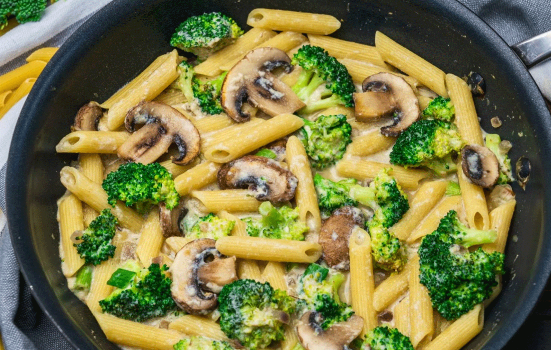 Die Nudeln in Salzwasser kochen und parallel die Zwiebelwürfel mit den Pilzen in einer Pfanne anschwitzen. Kurz darauf die Brokkoli-Röschen dazugeben und kräftig würzen.