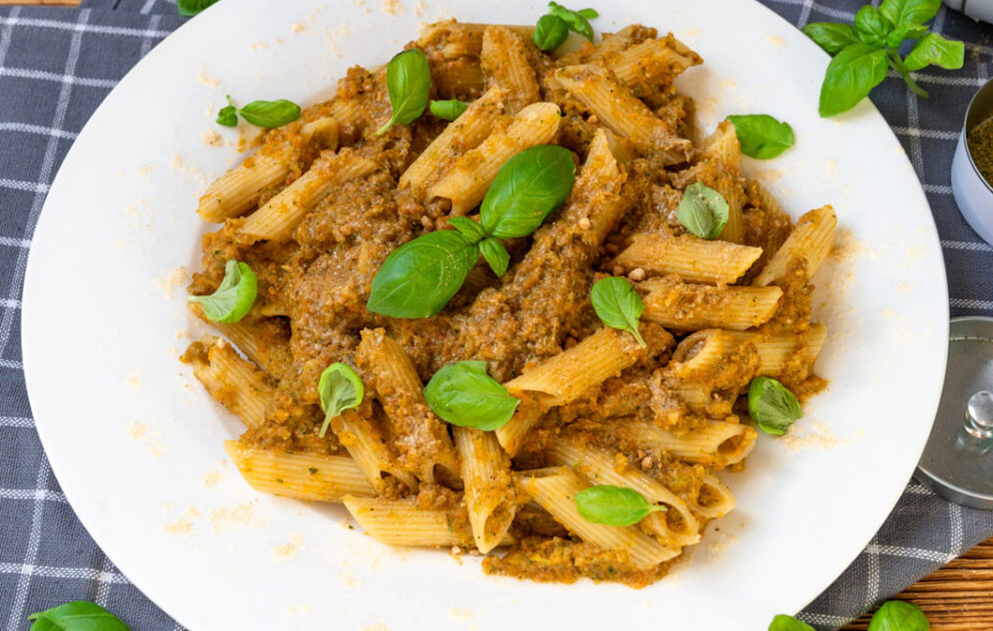 Das Protein Gemüse-Pesto mit der fertigen Pasta verrühren, mit dem "White Cheddar"-Spice sowie frischem Basilikum verfeinern und schmecken lassen.