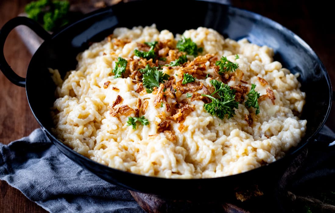 Die fertigen Spätzle mit dem Käsegewürz und den zwei Käsesorten mischen. Mit den Röstzwiebeln sowie der Frühlingszwiebel toppen und genießen.