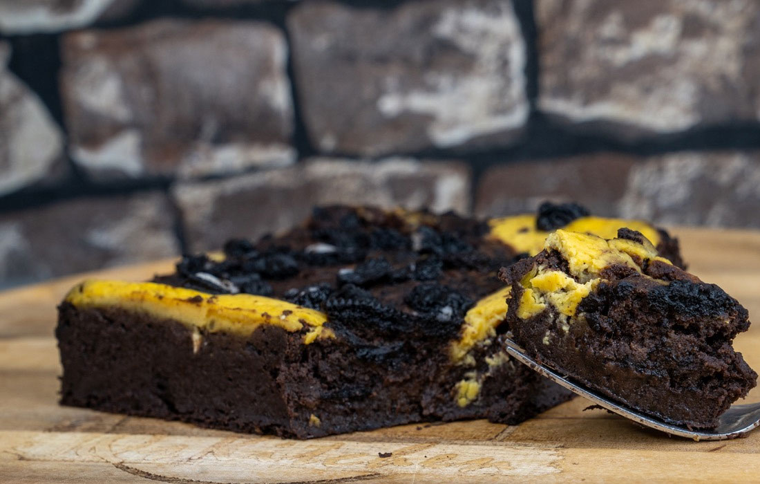 Die Cheesecake Masse anrühren, auf den Brownie Boden geben und mit einer Gabel einen Swirl ziehen.