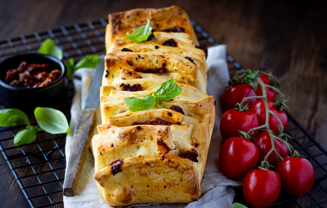 In die Kastenform geben (wichtig: nicht zu eng/fest reindrücken, sonst wird das Brot zu kompakt!) und optional mit den getrockneten Tomaten toppen.