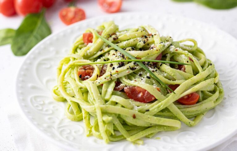 So wie mit diesem Pasta Gericht! Denn dieses 10min Pasta Rezept mit fettarmen Avocado-Spinat Pesto ist der nächste Knaller, den Ihr auf keinen Fall verpassen wollt.