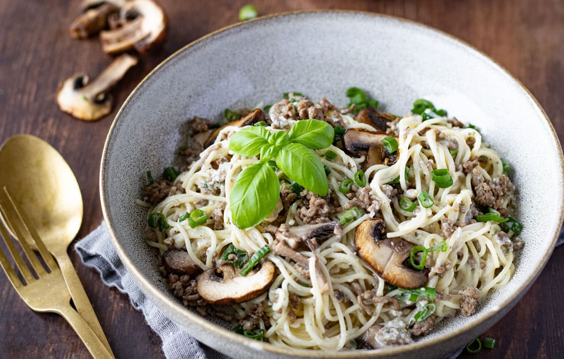 In der Zwischenzeit die Bolognese Sauce zubereiten. Dafür etwas Ölspray in die Pfanne geben, das Hackfleisch von allen Seiten braun anbrutzeln und schließlich die Zwiebeln, Lauchzwiebelringe sowie Champignons ebenfalls dazugeben.