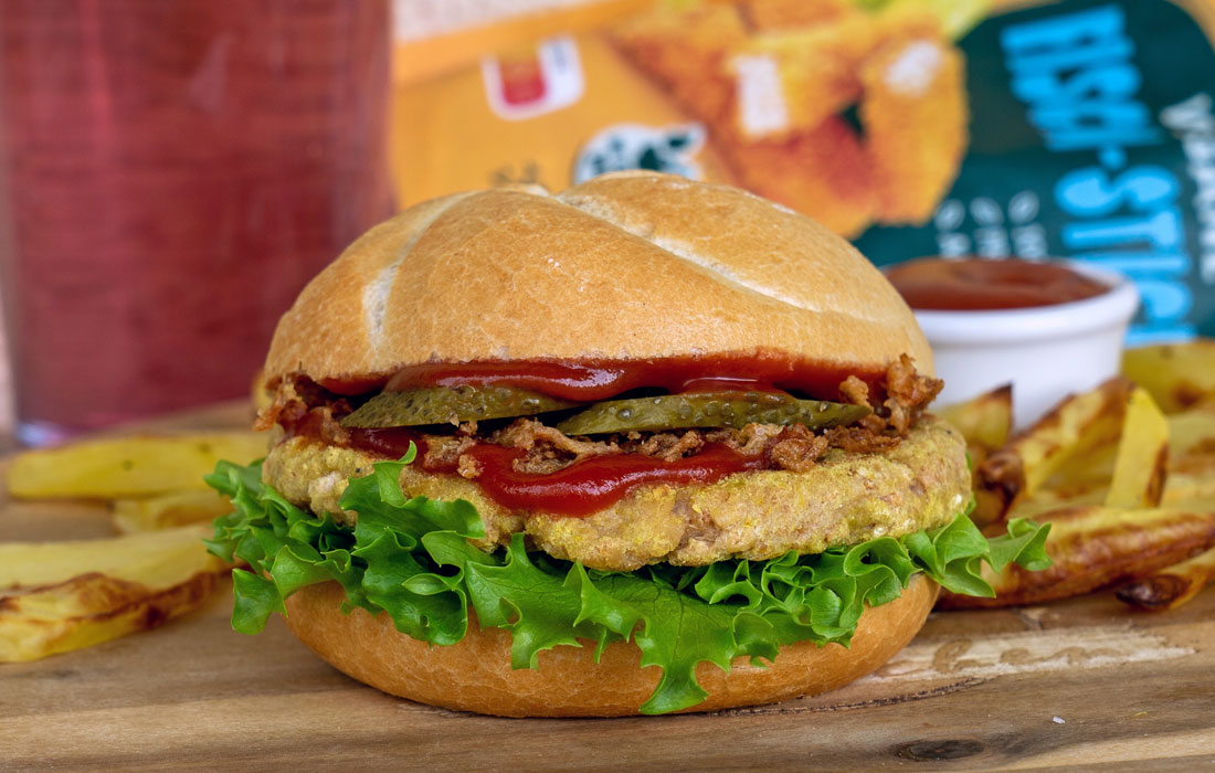 Den Greenforce „Fisch Sticks“-Mix mit 60ml Wasser vermengen und ein Patty daraus formen. Bei Bedarf zusätzlich mit dem veganen Ei-Mix panieren.
