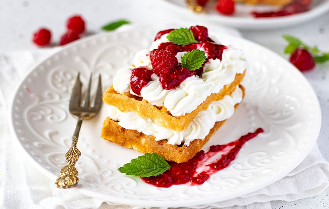 Die ausgebackenen Waffeln und die Quarkmasse im Wechsel schichten und pro Schicht jeweils ein paar Himbeeren auf die Quarkmasse geben.