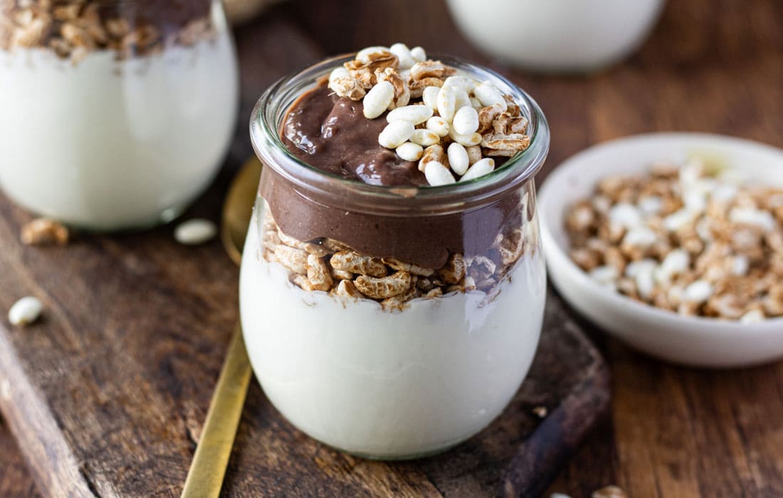 Den Schokopudding jeweils auf der Oberfläche verstreichen und mit dem gepufften Dinkel toppen.